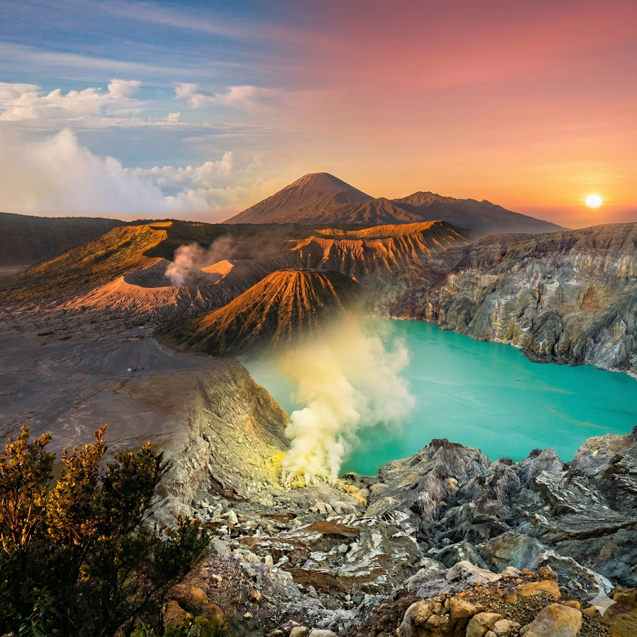 A dramatic sunrise over the sand sea of Bromo, followed by a visit to witness the blue fire phenomenon at Ijen Crater.